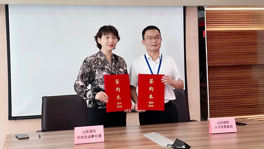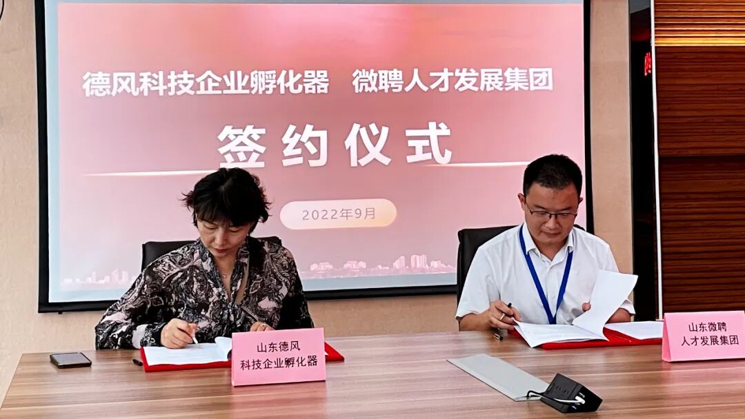 9月2日上午,山东德风科技企业孵化器有限公司(以下简称“德风孵化器”)与山东微聘人才发展集团有限公司(以下简称“微聘人才集团”)签署战略合作协议。德风孵化器总经理李少敏,副总经理徐莹、张辉,微聘人才集团董事长、职骋人才创始人屈子千、副总经理焦守猛出席签约仪式。李少敏总经理首先对微聘人才集团相关人员的到来表示欢迎,接着介绍了德风孵化器近年来发展情况和今后的规划布局,双方业务拓展的目标和愿景一致,交流合作空间广阔、潜力巨大。屈子千董事长介绍了微聘人才集团及其子公司职骋人才等在人力资源服务领域的卓越成果,集团拥有优质的政府、高校、企业、人才的人力资源生态链,深耕人才垂直领域数年,建立了一支专业有活力的年轻团队。